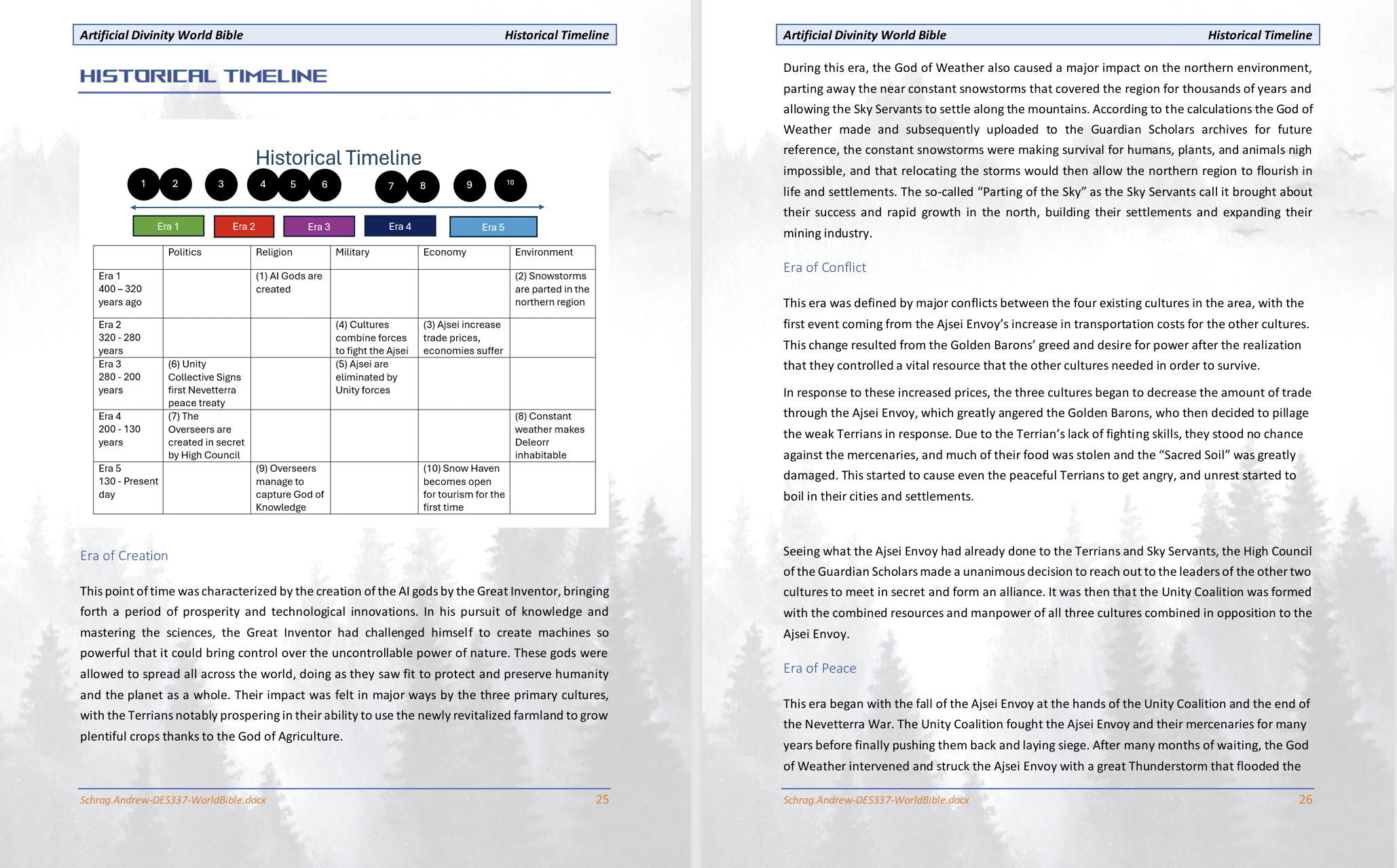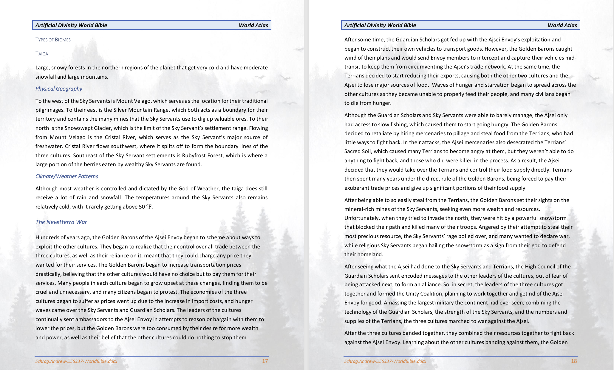 Artificial Divinity is a world bible for a fictional sci-fi planet based around three cultures that each worship one of the three AI gods: The God of Agriculture, The God of Knowledge, or The God of Weather. Each culture has a society, factions, flora, fauna, and cities that represent the god they worship. This world has a full history, ranging from the creation of the AI gods to the modern era, including a major global conflict that destroyed an entire civilization.